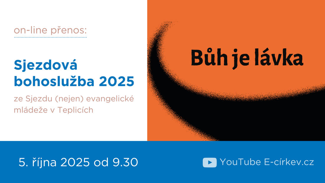 Nabízíme přímý přenos závěrečné bohoslužby ze Sjezdu (nejen) evangelické mládeže, který se letos koná od 3. do 5. října v Teplicích. Bohoslužba začíná v neděli 5. října od 9.30 hod. a vedou ji Mikuláš Vymětal a Marianna Sláviková.