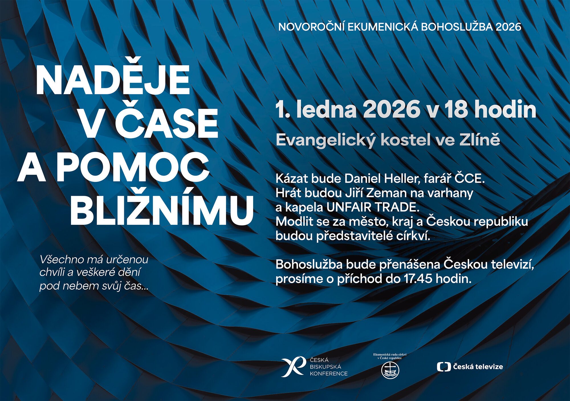 Tradiční ekumenická bohoslužba se koná 1. ledna 2026 od 18.00 hodin v evangelickém kostele ve Zlíně. Připojit se k ní můžete na místě nebo prostřednictvím přímého přenosu České televize.